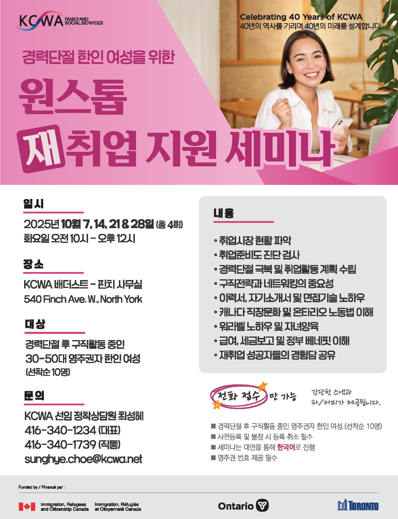 KCWA는 영주권을 받고 캐나다에 오신 후 육아나 여러가지 상황 때문에 경력이 단절된 한인여성들을 대상으로 '원스톱 재취업 지원 세미나'를 4회에 걸쳐 진행합니다.