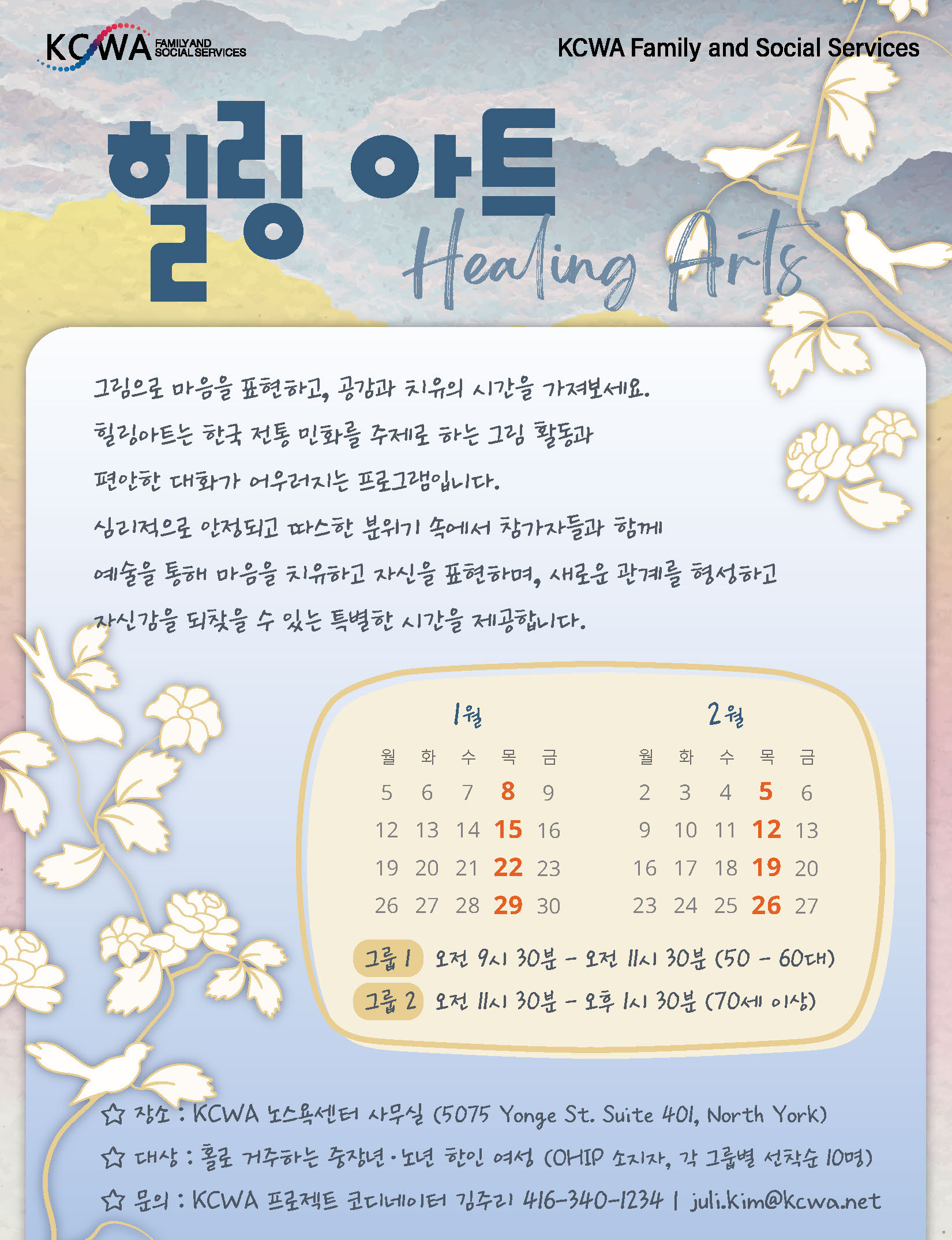 KCWA는 '힐링 아트 (Healing Arts)' 프로젝트를 1월 8일 (목) 부터 8회에 걸쳐 대면으로 진행합니다.