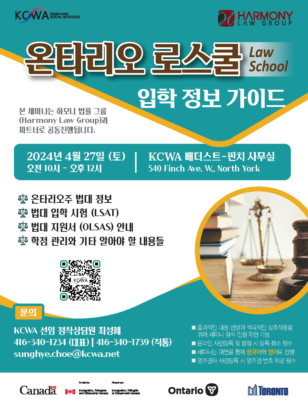 KCWA의 '온타리오 로스쿨(Law School) 입학 정보 가이드' 세미나가 4월 27일 (토) 오전 10시부터 KCWA 배더스트-핀치 사무실 (540 Finch Ave. W., North York)에서 열립니다.
